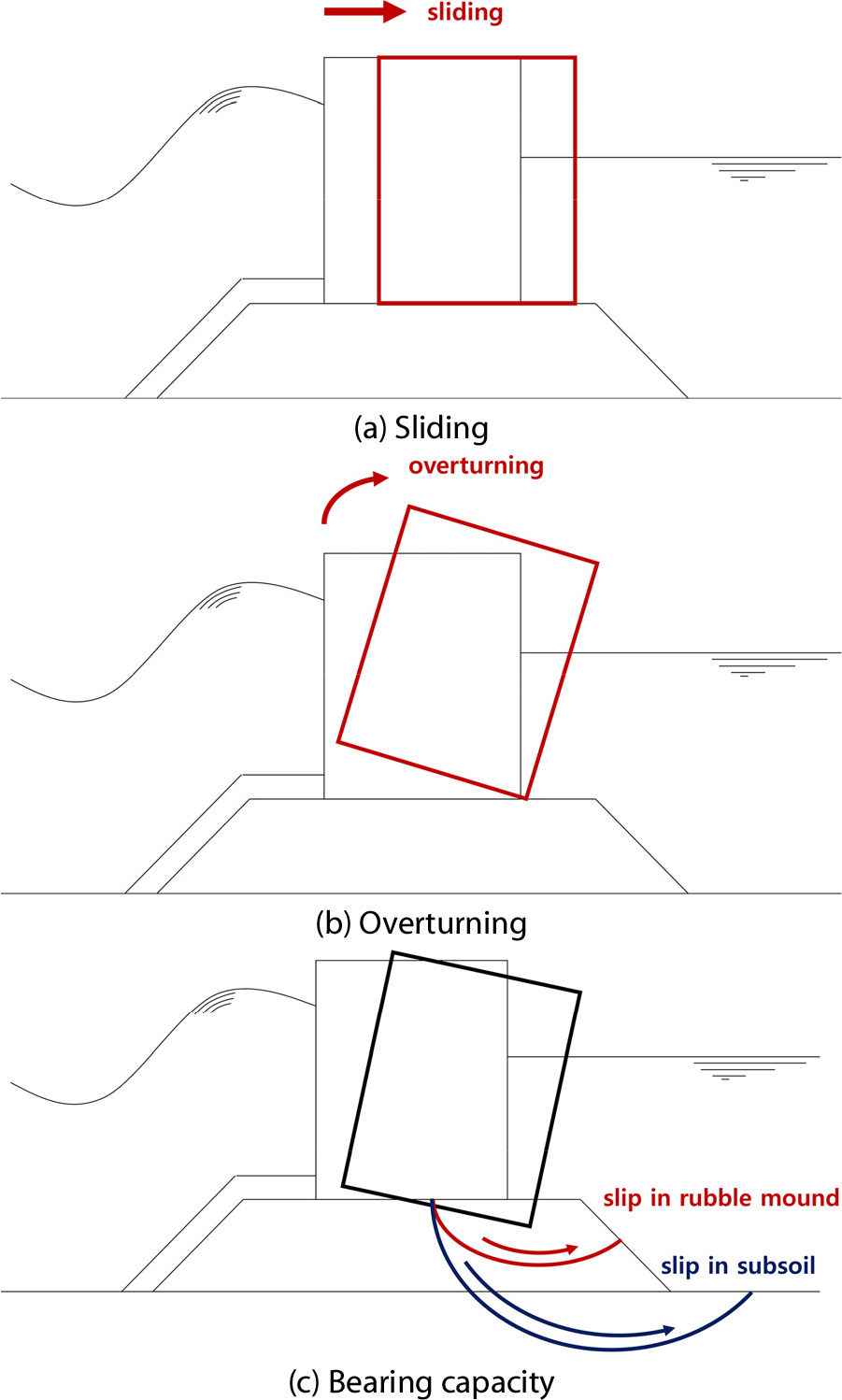 - This study performed a slip failure analysis and evaluated the structural stability of a rubble mound breakwater under wave pressure using the …