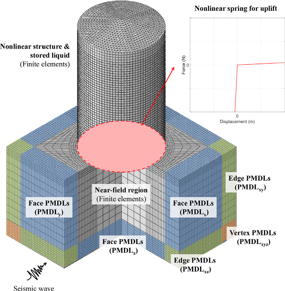 - This study develops a finite element analysis framework to rigorously evaluate the nonlinear seismic response of unanchored cylindrical liquid storage tanks resting on flexible soil, with explicit consideration of base uplift. Soil-structure interaction forces, including energy radiation into the infinite soil domain, and hydrodynamic forces generated by the stored liquid are coupled within a nonlinear finite element model of the tank, accounting for both material and geometric nonlinearities. Base uplift is simulated using nonlinear spring elements with negligible tensile stiffness. The proposed model is employed to accurately compute the seismic response of liquid storage tanks subjected to earthquake ground motion. The results indicate that consideration of material and geometric nonlinearities significantly increases stresses in the tank wall, resulting in enhanced plastic response. However, when base uplift is included, the base plate is allowed to uplift freely, which reduces structural stresses and plastic deformation. These findings demonstrate that accurate seismic response evaluation of fluid-structure-soil interaction systems that are not fully anchored to the ground requires rigorous consideration of boundary nonlinearities, such as separation at the soil-structure contact interface, in addition to material and geometric nonlinear behavior.