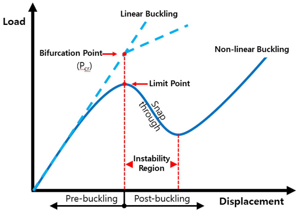 - This study conducts a non-linear buckling analysis on mooring suction anchors using the finite element method (FEM) to evaluate their buckling behavior. The results were compared and analyzed against the values in current design codes commonly applied to the buckling design of suction anchors. The numerical model was constructed using shell elements to appropriately capture the buckling modes. The analysis evaluated both the simplified loading conditions used in design codes and the complex combined loading states of suction anchors installed in subsea environments. The results indicated that for suction anchors, out-of-plane loads are more dominant than in-plane axial loads. While the Det Norske Veritas (DNV) design code, which covers out-of-plane loading conditions, appeared to demonstrate higher applicability, an accurate evaluation of buckling behavior using FEA is necessary for cases involving torsion, shear force, and hydrostatic out-of-plane loads. Additionally, further research is required for the estimation of buckling strength and safety factors to ensure consistent safety levels when performing buckling evaluations based on both design codes and numerical analysis.