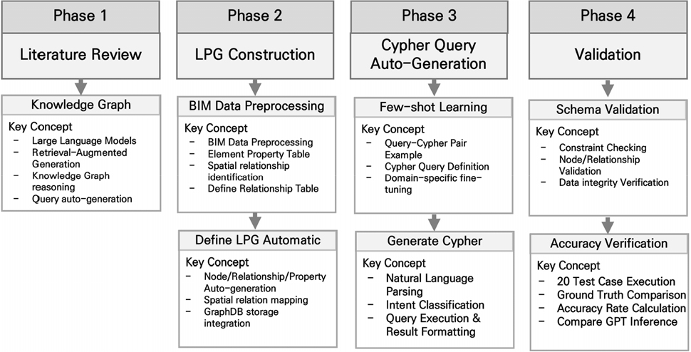 - Recently, Building Information Modeling (BIM) has evolved beyond three-dimensional modeling, increasingly focusing on the quality of standardized attribute data and systematic data management. Accordingly, ontology- and knowledge-graph–based data representation and reasoning approaches have increasingly gained attention. Knowledge-graph–based BIM data can support practical tasks such as structural relationship analysis, design review, and quantity and attribute information retrieval. However, practical adoption is limited by the need to manually write graph query languages, such as SPARQL and Cypher, which requires detailed knowledge of graph schemas and query syntax. To address this limitation, a GraphRAG-based automated query generation framework that converts natural-language questions into graph queries is proposed. A CSV-to-Labeled Property Graph (LPG) pipeline is developed to automate graph construction by generating nodes and relationships from rule-based attribute and relationship tables derived from bridge BIM data. In addition, a few-shot learning–based prompt design is utilized to generate Cypher queries from natural-language inputs automatically. The proposed framework is implemented as the Graph-ACQ system and validated using rigid-frame bridge BIM data. Experimental results demonstrate 100% accuracy in schema validity and query generation, with an average processing time of 7.1s. The proposed approach enables intuitive, relationship-oriented BIM data querying and supports scalable application across diverse infrastructure domains.