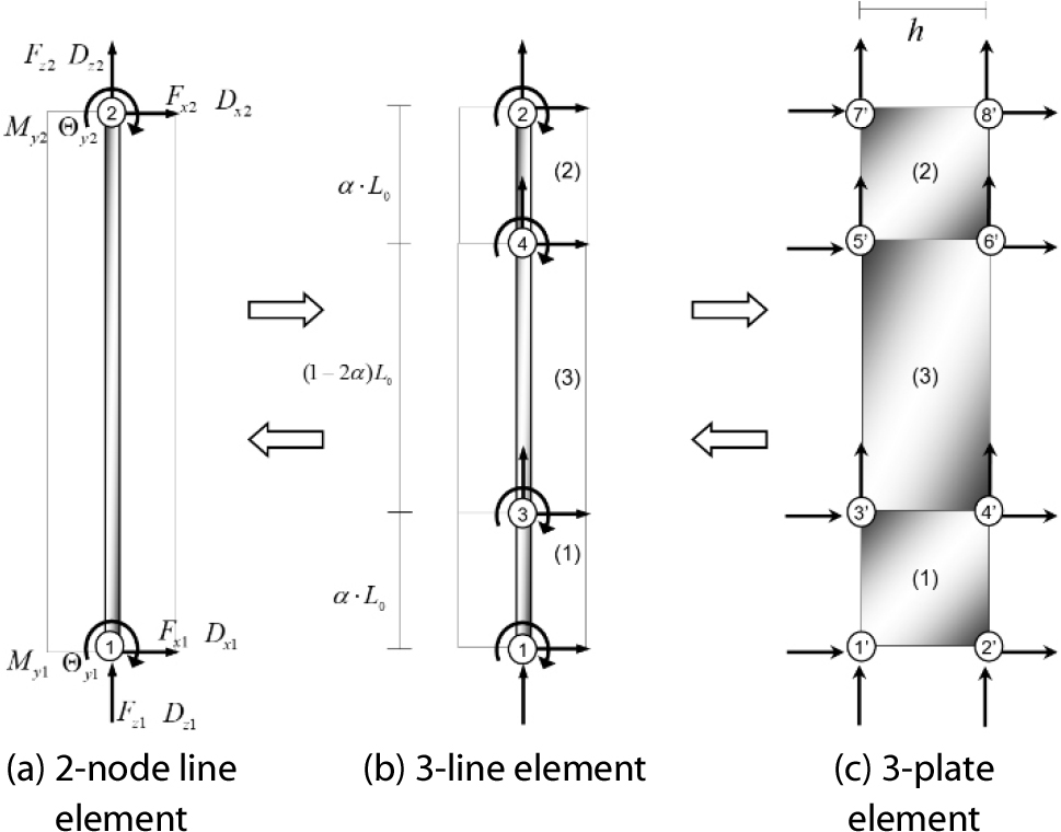 - Shear failure followed by axial collapse in reinforced concrete (RC) columns with insufficient transverse reinforcement represens a critical structural failure mode. Conventional analytical models often fail to accurately capture flexural-shear-axial interaction effects, whereas detailed finite element methods entail substantial computational cost. This study proposes a novel macro-element model that integrates material-level accuracy with the computational efficiency of line elements. The column is discretized into three elements along the longitudinal axis. Plate elements are formulated using a four-node plane-stress model incorporating the modified compression field theory (MCFT) to represent biaxial stress states and concrete compression softening. A double-nested iteration scheme is developed to satisfy equilibrium conditions. Validation against experimental data demonstrates that the proposed model accurately reproduces post-peak strength degradation and shear failure behavior, thereby addressing the key limitations of conventional fiber-based models.
